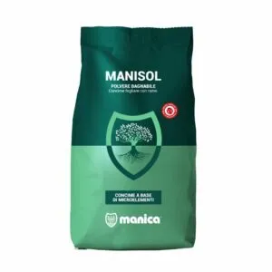 Manisol è un concime fogliare in polvere bagnabile (acquistabile direttamente nel nostro shop online in confezione da 15 Kg). Oltre a determinare un importante apporto di rame per le esigenze nutrizionali della pianta, rappresenta una efficace protezione nei confronti dei colpi di calore e delle bruciature causate dalle radiazioni solari. Il film biancastro che si forma sulla pianta trattata con questo concime biologico la protegge dai raggi solari e dai rischi di scottature: riduce la evapotraspirazione e consente il mantenimento di un’adeguata umidità dei tessuti vegetali.